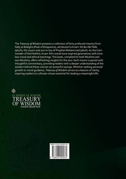 The Treasury of Wisdom presents a collection of forty profound maxims from Nahj al-Bal¿gha (Peak of Eloquence), attributed to Imam 'Al¿ ibn Ab¿ T¿lib (pbuh), the cousin and son-in-law of Prophet Müammad (pbuh). As the Commander of the Faithful, Imam 'Al¿'s words have inspired generations with timeless moral and ethical teachings. This book, compiled for Muslims and non-Muslims, offers refreshing insights into the soul. Each maxim is paired with thoughtful commentary, giving readers a deeper understanding of the wisdom behind these concise yet powerful sayings. Whether seeking personal growth or moral guidance, The Treasury of Wisdom is a beacon of clarity, inspiring readers to cultivate virtues essential for leading a meaningful life.