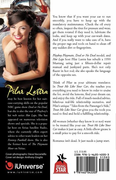 You know that if you want your car to run smoothly, you have to keep up with the mandatory maintenance. Check the oil every so often, inspect the tires for pressure and wear, get them rotated if they need it, lubricate the locks, and keep up with your car-wash dates. And if you really want to take care of it, have the proper rags and tools on hand to clean off any sudden dirt or fingerprints. Playboy Playmate, Deal or No Deal model, and Hot Laps host Pilar Lastra has rebuilt a 1990 Mustang using just a fifteen-dollar repair manual and junkyard parts. She's not only fluent in hot rod; she also speaks the language of the opposite sex. Think of Pilar as your ultimate translator. In Treat Me Like Your Car, she teaches you everything you need to know in order to cruise the lot, avoid the lemons, find your dream car, and enjoy the ride. Full of much-needed advice, hilarious real-life relationship scenarios, and Pilar's unique "Tales from the Passenger's Side," Treat Me Like Your Car gives you the tools you need to find and hold a fulfilling relationship. All women (whether they know it or not) want to be treated like your car. Treat Me Like Your Car makes it just as easy. A little elbow grease is a small price to pay for a smooth ride.
