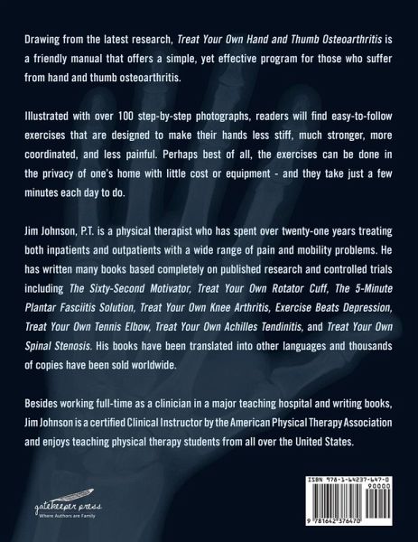*control arthritic hand pain *get rid of joint stiffness *grip things easier *improve hand coordination *move your hands easier *manipulate small objects better *relieve thumb pain *do everyday tasks with no pain *get strong hands Created by a board-certified physical therapist, the Treat Your Own Hand and Thumb Osteoarthritis program is the only set of specific, targeted exercises your hands will ever need to get out of pain and stay healthy. 4.5/5 stars after 100+ verified ratings - yes, it really works!