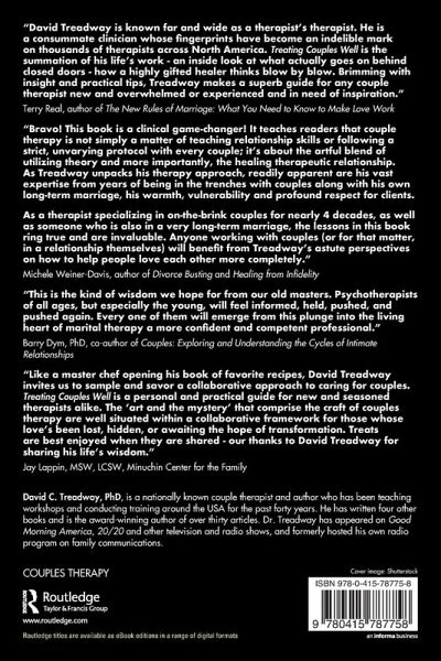 Treating Couples Well shows clinicians how to create a collaborative approach to couple therapy, which will empower couples to take charge of their own treatment. Written in an engaging and conversational style, the book carefully explains how to help couples choose between a variety of clinical approaches and offers effective treatment strategies for a wide range of issues, including infidelity, intimacy and sexuality, communication, mental illness, and addiction. Chapters also explore the importance of considering the therapist's own life experience and its impact on working with couples. Practical interventions, clinical vignettes, and homework exercises are included throughout to help therapists to successfully support the needs of each couple and to encourage meaningful work between sessions. Drawing on a plethora of case examples from the career of a leading couple therapist, Treating Couples Well will be a valuable resource to couple and marriage and family therapists at all levels.