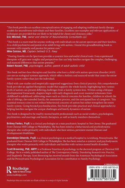 1. The Basics 2. Ecological Systems Approach 3. The Autism Trait Scale (ATS) 4. Early Diagnosis, Clinical Concerns, and School Sytem 5. Debunking the IEP 6. Subsytems 7. Family Therapy with Adolescents and Clinical Concerns 8. Older Adolescents and Young Adults 9. Older Adults and Family Changes 10. Treating Families on The Spectrum