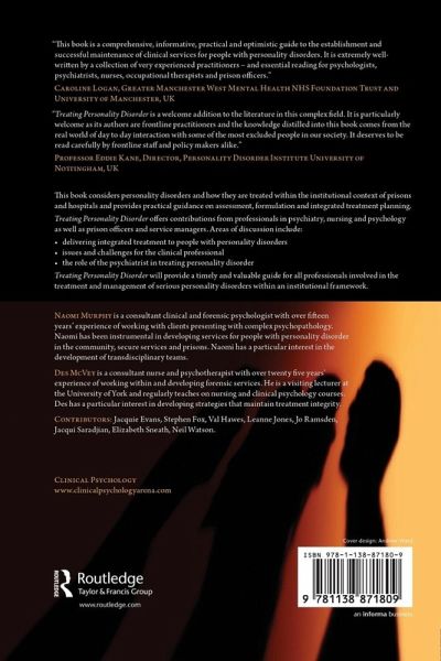 McVey Murphy Introduction. Murphy McVey The Difficulties that Staff Experience in Treating Individuals with Personality Disorder. Evans Watson Assessing Personality Disorder within a Formulation Framework. Saradjian Murphy McVey Delivering Integrated Treatment to People with Personality Disorder. Murphy McVey Fundamental Treatment Strategies for Optimising Interventions with People with Personality Disorder. McVey Saradjian Organisational Challenges to Providing Services for Personality Disordered People. Murphy Effective Transdisciplinary Teamworking. McVey The Role of the Nurse in Treating People with Personality Disorder. Jones The Role of the Occupational Therapist in Treating People with Personality Disorder. Fox The Role of the Prison Officer (Dangerous and Severe Personality Disorder in the Prison System). Hawes The Role of the Psychiatrist in Treating Personality Disorder. Ramsden Beyond Therapy - The Wider Role of the Psychologist in Treating Personality Disorder. Sneath Issues and Challenges for the Clinical Professional.