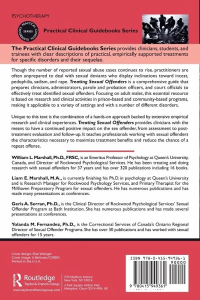 Through extensive consideration of current research, theory and practice, Treating Sexual Offenders provides a guide to the assessment, treatment, and evaluation of a number of different disorders. Provides therapists with the means to have a continued positive impact on the sex offender, from assessment to post-treatment evaluation and follow-up. Includes fetishisms, transvestic fetishisms, exhibitionism, frottage, pedophilia, sexual sadism, sexual masochism, telephone scatologia, voyeurism, rape, child molestation, and incest. The Therapist Rating Scale used and referenced throughout the text is available for download below. Therapist Rating Scale (pdf file)
