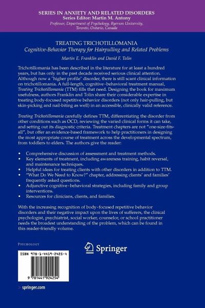 "Treating Trichotillomania: Cognitive-Behavioral Therapy of Hairpulling and Related Problems focuses primarily on trichotillomania (TTM) ... . it is concise, well written, empirically grounded, and richly filled with clinical examples and samples of patient-therapist dialogue that clearly illustrate the various techniques. ... In summary, this book is essential reading for all clinicians involved in the treatment of TTM. ... Franklin and Tolin have performed a valuable clinical service by clearly showing readers how to implement this intervention along with other cognitive-behavioral interventions for TTM." (Steven Taylor, PsycCRITIQUES, Vol. 53 (11), 2008)