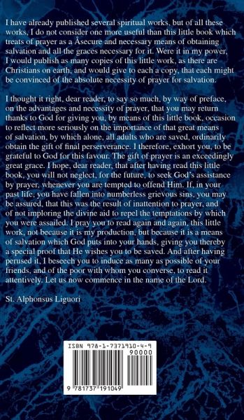 This is a very comprehensive treatise on Prayer by a Doctor of the Church, St Alphonsus Liguori and is a must read for all Catholics. There are so many elements of prayer that are misunderstood or simply overlooked that are essential to our Catholic Faith and especially for Salvation. I have already published several spiritual works, but of all these works, I do not consider one more useful than this little book which treats of prayer as a secure and necessary means of obtaining salvation and all the graces necessary for it. Were it in my power, I would publish as many copies of this little work, as there are Christians on earth, and would give to each a copy, that each might be convinced of the absolute necessity of prayer for salvation. -St Alphonsus Liguori