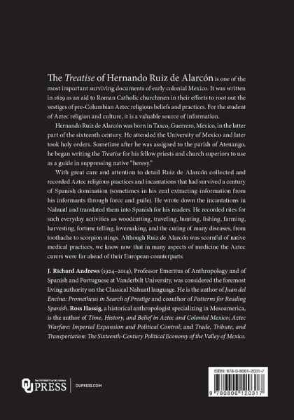 Volume 164 in the The Civilization of the American Indian Series The Treatise of Hernando Ruiz de Alarcón is one of the most important surviving documents of early colonial Mexico. It was written in 1629 as an aid to Roman Catholic churchmen in their efforts to root out the vestiges of pre-Columbian Aztec religious beliefs and practices. For the student of Aztec religion and culture is a valuable source of information. With great care and attention to detail Ruiz de Alarcón collected and recorded Aztec religious practices and incantations that had survived a century of Spanish domination (sometimes in his zeal extracting information from his informants through force and guile). He wrote down the incantations in Nahuatl and translated them into Spanish for his readers. He recorded rites for such everyday activities as woodcutting, traveling, hunting, fishing, farming, harvesting, fortune telling, lovemaking, and the curing of many diseases, from toothache to scorpion stings. Although Ruiz de Alarcón was scornful of native medical practices, we know now that in many aspects of medicine the Aztec curers were far ahead of their European counterparts. "J. Richard Andrews and Ross Hassig have produced what will undoubtedly be the definitive translation for some time.. The editors provide a valuable and comprehensive explanation of the ecclesiastical context of the conquest, native religion and medicine, and religious syncretism."- THE AMERICAS