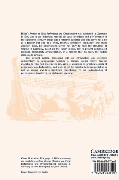 Hiller's Treatise on Vocal Performance and Ornamentation was published in Germany in 1780 and is an important manual on vocal technique and performance in the eighteenth century. Hiller was a masterful educator and was active not only as a teacher but as a critic, composer, conductor and music director. Thus, his observations served not only to raise the standards of singing in Germany, based on the Italian model, but to present complicated material, particularly ornamentation, in a manner that his peers, the middle class, could emulate. This present edition, translated with an introduction and extensive commentary by musicologist Suzanne J. Beicken, makes Hiller's treatise available for the first time in English. With its emphasis on practical aspects of ornamentation, declamation and style it will be valuable to instrumentalists as well as singers and is a significant contribution to the understanding of performance practice in the eighteenth-century.
