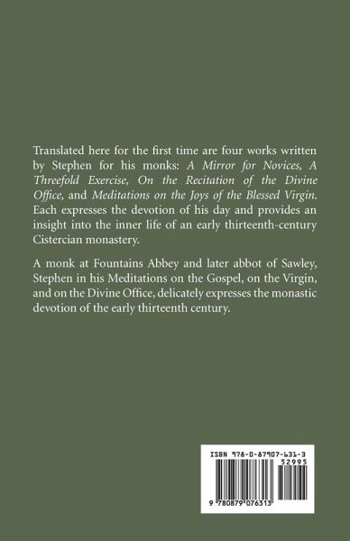 Translated here for the first time are four works written by Stephen for his monks: A Mirror for Novices, A Threefold Exercise, On the Recitation of the Divine Office, and Meditations on the Joys of the Blessed Virgin. Each expresses the devotion of his day and provides an insight into the inner life of an early thirteenth century Cistercian monastery.