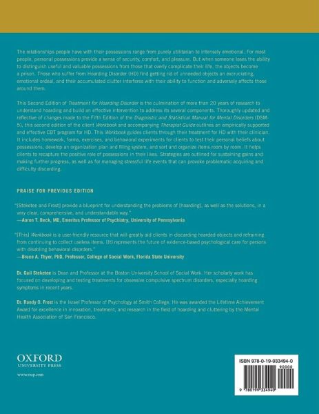 The relationship people have with their possessions ranges from purely utilitarian to intensely emotional. For most people, their personal possessions provide them with a sense of security, comfort, and pleasure. However, if someone loses the ability to distinguish useful or important possessions from those that make life overly complicated, the objects can become a prison. For people who suffer from Hoarding Disorder (HD), the process of getting rid of unneeded objects is not easy. For them, possessions never "feel" unneeded and trying to get rid of them is an excruciating emotional ordeal. This Second Edition of Treatment for Hoarding Disorder is the culmination of more than 20 years of research on understanding hoarding and building an effective intervention to address its myriad components. Thoroughly updated and reflective of changes made to the Fifth Edition of the Diagnostic and Statistical Manual for Mental Disorders (DSM-5), this second edition of the client Workbook and accompanying Therapist Guide outlines an empirically supported and effective CBT program for treating hoarding disorder. This Workbook is meant to guide clients through their treatment for hoarding disorder with their clinician. It includes homework, forms, exercises, and behavioral experiments for clients to test their personal beliefs about possessions, develop an organization plan and filing system, and sort and organize items room by room. A major goal of the treatment is to recapture the positive role of possessions in the lives of people with hoarding problems, and strategies are outlined for sustaining gains and making further progress, as well as for managing stressful life events that can provoke problematic acquiring and difficulty discarding.