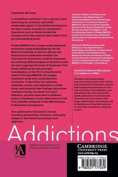 Project MATCH was a large-scale treatment evaluation study established by the US National Institute on Alcohol Abuse to determine whether the treatment of alcoholism could be improved by matching different types of alcoholics with the most appropriate kinds of treatment. This book, edited by the two principal investigators, was the first comprehensive report of Project MATCH, the largest treatment study ever conducted with alcoholics. It describes the rationale, methods, results and implications of the study, and presents findings about how treatment works, for whom it is most effective, and who does best in different kinds of treatment. It also offers some of the first scientific evidence on the effectiveness of Alcoholics Anonymous. The audience for this book is broad, including researchers, clinicians and policy makers in the field of alcoholism and addiction.