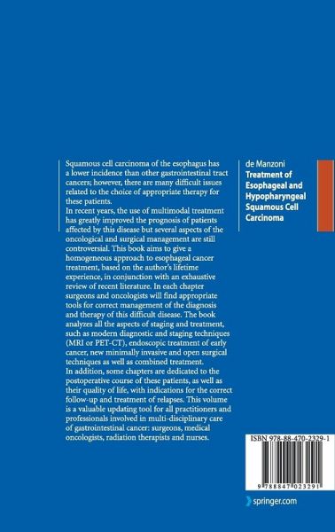 Squamous cell carcinoma of the esophagus has a lower incidence than other gastrointestinal tract cancer; however, there are many difficult issued related to the choice of appropriate therapy for these patients. In recent years, the use of multimodal treatment has greatly improved the prognosis of patients affected by this disease but several aspects of the oncological and surgical management are still controversial. This book aims to give a homogeneous approach to esophageal cancer treatment, based on the author's lifetime experience in conjunction with exhaustive review of recent literature. In each chapter surgeons and oncologists will find appropriate tools for correct management of the diagnosis and therapy of this difficult disease. The book analyzes all the aspects of staging and treatment, such as modern diagnostic and staging techniques (MRI or PET-CT), endoscopic treatment of early cancer, new minimally invasive and open surgical techniques, and combined treatment. In addition, there are chapters dedicated to the postoperative course of these patients, as well as their quality of life, with indications for the correct follow-up and treatment of relapses.