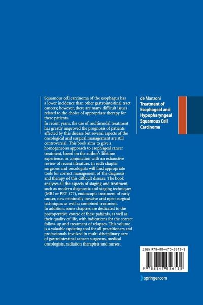 Squamous cell carcinoma of the esophagus has a lower incidence than other gastrointestinal tract cancer; however, there are many difficult issued related to the choice of appropriate therapy for these patients. In recent years, the use of multimodal treatment has greatly improved the prognosis of patients affected by this disease but several aspects of the oncological and surgical management are still controversial. This book aims to give a homogeneous approach to esophageal cancer treatment, based on the author's lifetime experience in conjunction with exhaustive review of recent literature. In each chapter surgeons and oncologists will find appropriate tools for correct management of the diagnosis and therapy of this difficult disease. The book analyzes all the aspects of staging and treatment, such as modern diagnostic and staging techniques (MRI or PET-CT), endoscopic treatment of early cancer, new minimally invasive and open surgical techniques, and combined treatment. In addition, there are chapters dedicated to the postoperative course of these patients, as well as their quality of life, with indications for the correct follow-up and treatment of relapses.