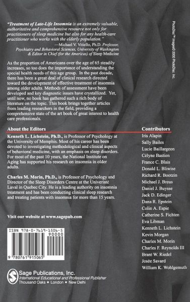 PART ONE: OVERVIEW Sleep and Aging - Kevin Morgan Characteristics of Older Adults with Insomnia - Catherine S Fichten et al Assessment and Differential Diagnosis - Colin A Espie PART TWO: INTERVENTION STRATEGIES Treatment Overview - Kenneth L Lichstein and Charles M Morin Sleep Hygiene - Brant W Riedel Sleep Restriction Therapy - William K Wohlgemuth and Jack D Edinger Stimulus Control - Richard R Bootzin and Dana R Epstein Relaxation - Kenneth L Lichstein Cognitive Therapy - Charles M Morin, Josée Savard and France Blais Pharmacologic Treatment - Daniel J Buysse and Charles F Reynolds III PART THREE: SPECIAL TREATMENT TOPICS Discontinuation of Sleep Medications - Charles M Morin, Lucie Baillargeon and Célyne Bastien Secondary Insomnia - Kenneth L Lichstein Insomnia in Dementia and in Residential Care - Donald L Bliwise and Michael J Breus