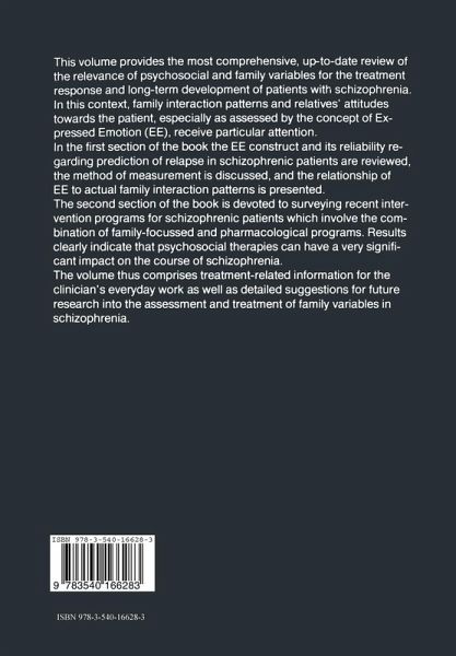 Treatment of Schizophrenia: Historical Aspects.- A. Prediction of the Course of Schizophrenia.- I. Patient Attributes.- 1. Outcome and Prediction of Outcome in Schizophrenia: Results from the Literature and from Two Personal Studies.- II. Family Attributes.- 2. An Introduction to EE Measurement and Research.- 3. Expressed Emotion in Cross-Cultural Context: Familial Respones to Schizophrenic Illness Among Mexican Americans.- 4. Do Relatives Express Expressed Emotion?.- 5. Short-Term Relapse in Young Schizophrenics: Can It Be Predicted and Affected by Family (CFI), Patient, and Treatment Variables? An Experimental Study.- 6. Emotional Atmosphere in Families of Schizophrenic Outpatients: Relevance of a Practice-Oriented Assessment Instrument.- 7. The Marriages and Interaction Patterns of Depressed Patients and Their Spouses: Comparison of High and Low EE Dyads.- 8. Patterns of Emotional Response in the Families of Schizophrenic Patients.- B. Modification of the Course of Schizophrenia by Family Interventions.- 9. Working with Families of Acute Psychotics: Problems for Research and Reconsideration.- 10. Family Education as a Component of Extended Family-Oriented Treatment Programs for Schizophrenia.- 11. Pilot Study of the Impact of a Family Education Program on Relatives of Recent-Onset Schizophrenic Patients.- 12. Psychoeducational Family Therapy.- 13. Controlled Trial of Social Intervention in the Families of Schizophrenic Patients.- 14. Behavioral Family Therapy for Schizophrenia: Clinical, Social, Family, and Economic Benefits.- 15. The Impact of Family Intervention Programs on Family Communication and the Short-Term Course of Schizophrenia.- 16. The Psychosocial Program of Treatment of Schizophrenic Patients in the Crakow Psychiatric Clinic.- Epilogue.- 17. Coping andCompetence as Protective Factors in the Vulnerability-Stress Model of Schizophrenia.