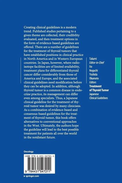 Creating clinical guidelines is a modern trend. Published studies pertaining to a given theme are collected, their credibility evaluated, and then treatment options in the form of evidence-based guidelines are offered. There are a number of guidelines for the treatment of thyroid tumors that have established positions in clinical practice in North America and in Western European countries. In Japan, however, where radioisotope facilities are of limited availability, treatment plans for differentiated thyroid cancer differ considerably from those of America and Europe, and the associated clinical guidelines need modification before they can be adopted. In addition, although thyroid tumor is a common disease in endocrine practice, its management can differ even among specialists. Thus, a Japanese clinical guideline for the treatment of thyroid tumor was desired by many clinicians. As a combination of evidence-based and consensus-based guidelines for the treatment of thyroid tumor, this book offers alternatives to conventional approaches in the West. Ultimately, the authors hope the guideline will lead to the best possible treatment for patients all over the world in the not-distant future.