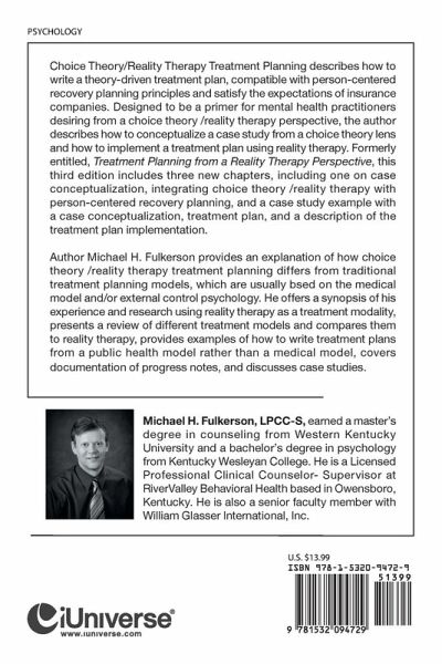 Choice Theory/Reality Therapy Treatment Planning describes how to write a theory-driven treatment plan, compatible with person-centered recovery planning principles and satisfy the expectations of insurance companies. Designed to be a primer for mental health practitioners desiring from a choice theory /reality therapy perspective, the author describes how to conceptualize a case study from a choice theory lens and how to implement a treatment plan using reality therapy. Formerly entitled, Treatment Planning from a Reality Therapy Perspective, this third edition includes three new chapters, including one on case conceptualization, integrating choice theory /reality therapy with person-centered recovery planning, and a case study example with a case conceptualization, treatment plan, and a description of the treatment plan implementation. Author Michael H. Fulkerson provides an explanation of how choice theory /reality therapy treatment planning differs from traditional treatment planning models, which are usually bsed on the medical model and/or external control psychology. He offers a synopsis of his experience and research using reality therapy as a treatment modality, presents a review of different treatment models and compares them to reality therapy, provides examples of how to write treatment plans from a public health model rather than a medical model, covers documentation of progress notes, and discusses case studies.