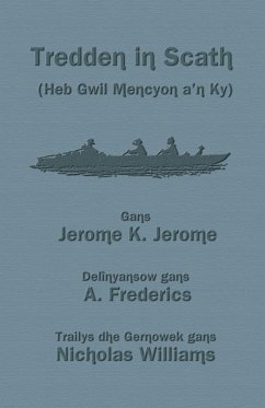 Yth yw an screfor ha'y dhew gothman, Jory ha Harrys, acordys y dhe vos ow lavurya re grev i'n dedhyow dewetha hag indella aga yêhes dhe sùffra. Yma an try den yonk ytho owth ervira kemeres degolyow in scath wàr Dhowr Tamys, ow tallath dhyworth Kyngston hag ow mos bys in Resohen. Ymowns y ow kemeres Montmorency, hèn yw aga broghky, gansans inwedh. Yma acownt rës i'n lyver a'ga aventurs hag a'ga droglabmow wàr an trumach; yth yw kefys ino inwedh lies whedhel wharthus, rag ensompel, ow tùchya bos prysonys in ker droya Lës Hampton, andhiogeleth barometrow ha'n problemow usy ow pertainya dhe dhesky an pîbow sagh. Y feu "Tredden in Scath" dyllys rag an kensa prës i'n vledhen 1889 ha nyns êth ev bythqweth mes a brynt dhia an termyn-na-dùstuny apert a'y vos meurgerys gans pùb henath. ---- The author and his two friends, George and Harris, agree that they have been working too hard and that their health in consequence is suffering. The three young men decide therefore to take a boating holiday on the Thames, starting at Kingston and ending in Oxford. They also take Montmorency, their pet terrier with them. The book recounts their adventures and mishaps on the trip and is punctuated by numerous hilarious passages about, for example, being trapped in Hampton Court Maze, the unreliabilty of barometers and the problems involved in learning to play the bagpipes. "Three Men in a Boat" was first published in 1889 and has never been out of print since-a remarkable testimony to its popularity.
