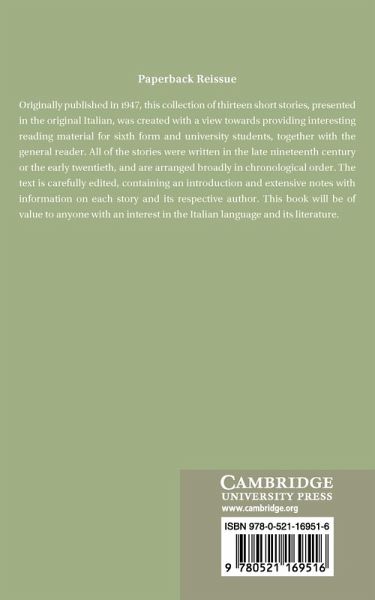 Originally published in 1947, this collection of thirteen short stories, presented in the original Italian, was created with a view towards providing interesting reading material for sixth form and university students, together with the general reader. All of the stories were written in the late nineteenth century or the early twentieth, and are arranged broadly in chronological order. The text is carefully edited, containing an introduction and extensive notes with information on each story and its respective author. This book will be of value to anyone with an interest in the Italian language and its literature.