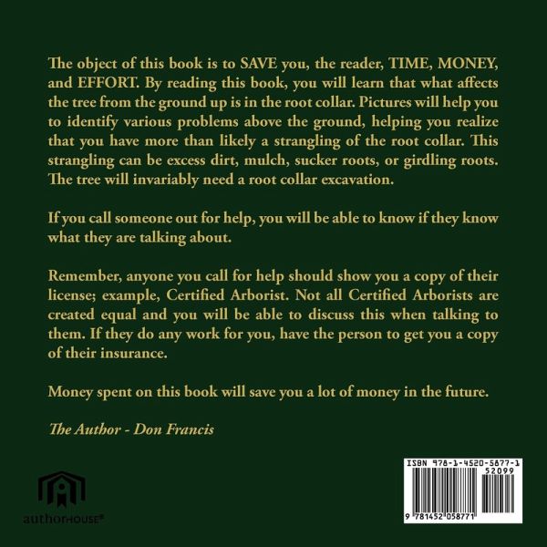 The object of this book is to SAVE you, the reader, TIME, MONEY, and EFFORT. By reading this book, you will learn that what affects the tree from the ground up is in the root collar. Pictures will help you to identify various problems above the ground, hleping you realize that you have more than likely a strangling of the root collar. This strangling can be excess dirt, mulch, sucker roots, or girdling roots. The tree will invariably need a root collar excavation. If you call someone out for help, you will be able to know if they know what they are talking about. Remember, anyone you call for help should show you a copy of their license; example, Certified Arborist. Not all Certified Arborists are created equal and you will be able to discuss this when talking to them. If they do any work for you, have the person to get you a copy of their insureance. Money spend on this book will save you a lot of money in the future. The Author - Don Francis