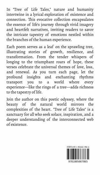 In "Tree of Life Tales," nature and humanity intertwine in a lyrical exploration of existence and connection. This evocative collection encapsulates the essence of life's journey through vivid imagery and heartfelt narratives, inviting readers to savor the intricate tapestry of emotions nestled within the branches of the human experience. Each poem serves as a leaf on the sprawling tree, illustrating stories of growth, resilience, and transformation. From the tender whispers of longing to the triumphant roars of hope, these verses celebrate the universal themes of love, loss, and renewal. As you turn each page, let the profound insights and enchanting rhythms transport you to a world where every experience-like the rings of a tree-adds richness to the tapestry of life. Join the author on this poetic odyssey, where the beauty of the natural world mirrors the complexities of the heart. "Tree of Life Tales" is a sanctuary for all who seek solace, inspiration, and a deeper understanding of the interconnected web of existence.