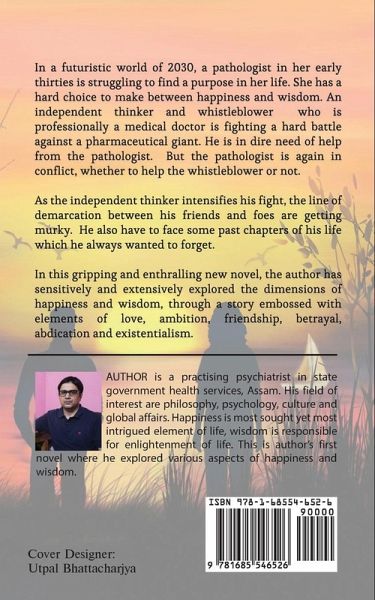 In a futuristic world of 2030, a pathologist in her early thirties, is struggling hard to find a purpose in her life. She has a hard choice to make between happiness and wisdom. An independent thinker and whistleblower, who is professionally a medical doctor, is making a hard fight against a pharmaceutical giant. He is in dire need of help from the pathologist. But she is again in conflict, whether to help the independent thinker or not. A neurosurgeon abdicated everything to live an ascetic life in a remote village. But does he have any ulterior motive? A motivational speaker is motivating the entire world, but how much he could motive himself? As the whistleblower intensifies his fight, the line of demarcation between his supporters and opposes is getting murky. He also have to face some past chapters of his life, which he always wanted to forget. In this gripping and enthralling new novel, author has sensitively and extensively explored the dimensions of happiness and wisdom, through a story embossed with elements of love, ambition, friendship, betrayal, abdication and existentialism.