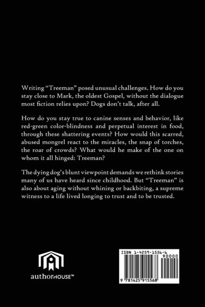 Writing "Treeman" posed unusual challenges. How do you stay close to Mark, the oldest Gospel, without the dialogue most fiction relies upon? Dogs don't talk, after all. How do you stay true to canine senses and behavior, like red-green color-blindness and perpetual interest in food, through these shattering events? How would this scarred, abused mongrel react to the miracles, the snap of torches, the roar of crowds? What would he make of the one on whom it all hinged: Treeman? The dying dog's blunt viewpoint demands we rethink stories many of us have heard since childhood. But "Treeman" is also about aging without whining or backbiting, a supreme witness to a life lived longing to trust and to be trusted.