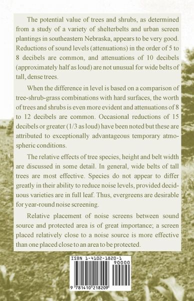 The potential value of trees and shrubs, as determined from a study of a variety of shelterbelts and urban screen plantings in southeastern Nebraska, appears to be very good. Reductions of sound levels (attenuations) in the order of 5 to 8 decibels are common, and attenuations of 10 decibels (approximately half as loud) are not unusual for wide belts of tall, dense trees. When the difference in level is based on a comparison of tree-shrub-grass combinations with hard surfaces, the worth of trees and shrubs is even more evident and attenuations of 8 to 12 decibels are common. Occasional reductions of 15 decibels or greater (1/3 as loud) have been noted but these are attributed to exceptionally advantageous temporary atmospheric conditions. The relative effects of tree species, height and belt width are discussed in some detail. In general, wide belts of tall trees are most effective. Species do not appear to differ greatly in their ability to reduce noise levels, provided deciduous varieties are in full leaf. Thus, evergreens are desirable for year-round noise screening. Relative placement of noise screens between sound source and protected area is of great importance; a screen placed relatively close to a noise source is more effective than one placed close to an area to be protected.