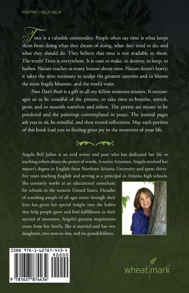 Time is a valuable commodity. People often say time is what keeps them from doing what they dream of doing, what they need to do, and what they should do. They believe that time is not available to them. The truth? Time is everywhere. It is ours to make, to destroy, to keep, to harbor. Nature teaches us many lessons about time. Nature doesn't hurry; it takes the time necessary to sculpt the greatest canyons and to bloom the most fragile blossom, and the world waits. Trees Don't Rush is a gift to all my fellow moment-missers. It encourages us to be mindful of the present, to take time to breathe, stretch, grow, and to nourish ourselves and others. The poems are meant to be pondered and the paintings contemplated in peace. The journal pages ask you to sit, be mindful, and then record reflections. May each portion of this book lead you to finding great joy in the moments of your life.