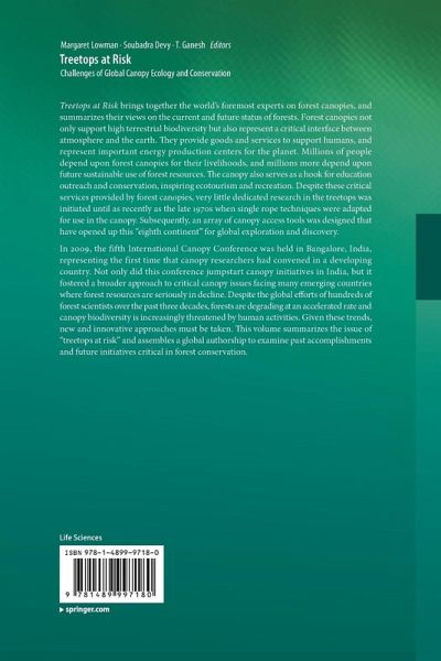 This volume uses the major findings of the 5th international canopy conference as a platform for organization, but it does not mimic the sessions and presentations of the conference itself. Instead, it builds on the important themes that emerged from the conference and solicits articles that represent future priorities and advancements for canopy science in the next decade. Despite the global efforts of hundreds of forest scientists over the past 3 decades, forests are degrading at an accelerated rate and biodiversity is increasingly threatened by human activities. Given these trends - despite the very best efforts of the world's best scientists - other approaches must be taken. This volume summarizes the issue of "treetops at risk" and assembles a global authorship toexamine past accomplishments and future initiatives critical in forest conservation.
