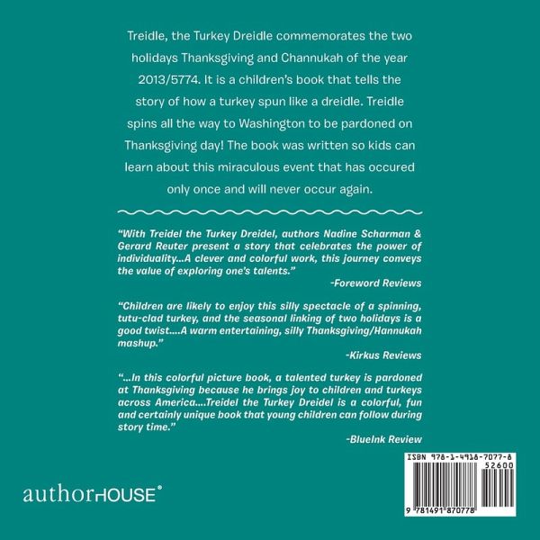 Treidle, the Turkey Dreidle commemorates the two holidays Thanksgiving and Channukah of the year 2013/5774. It is a childrens book that tells the story of how a turkey spun like a dreidle. Treidle spins all the way to Washington to be pardoned on Thanksgiving day! The book was written so kids can learn about this miraculous event that has occured only once and will never occur again.