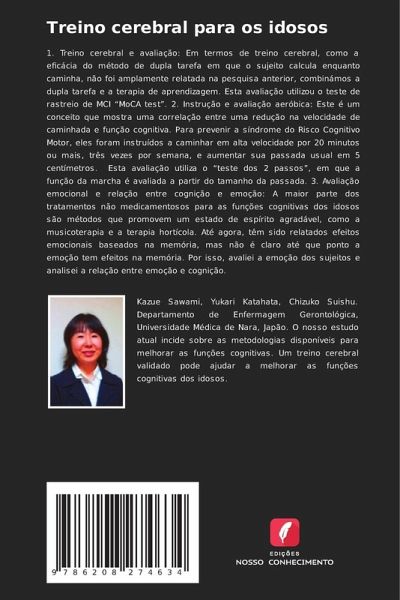 1. Treino cerebral e avaliação: Em termos de treino cerebral, como a eficácia do método de dupla tarefa em que o sujeito calcula enquanto caminha, não foi amplamente relatada na pesquisa anterior, combinámos a dupla tarefa e a terapia de aprendizagem. Esta avaliação utilizou o teste de rastreio de MCI ¿MoCA test¿. 2. Instrução e avaliação aeróbica: Este é um conceito que mostra uma correlação entre uma redução na velocidade de caminhada e função cognitiva. Para prevenir a síndrome do Risco Cognitivo Motor, eles foram instruídos a caminhar em alta velocidade por 20 minutos ou mais, três vezes por semana, e aumentar sua passada usual em 5 centímetros. Esta avaliação utiliza o ¿teste dos 2 passos¿, em que a função da marcha é avaliada a partir do tamanho da passada. 3. Avaliação emocional e relação entre cognição e emoção: A maior parte dos tratamentos não medicamentosos para as funções cognitivas dos idosos são métodos que promovem um estado de espírito agradável, como a musicoterapia e a terapia hortícola. Até agora, têm sido relatados efeitos emocionais baseados na memória, mas não é claro até que ponto a emoção tem efeitos na memória. Por isso, avaliei a emoção dos sujeitos e analisei a relação entre emoção e cognição.
