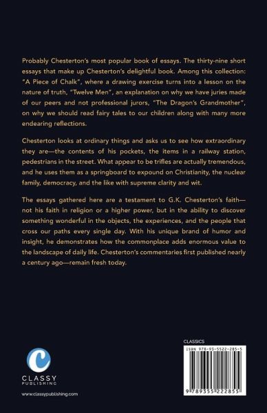 Probably Chesterton's most popular book of essays. The thirty-nine short essays that make up Chesterton's delightful book. Among this collection: "A Piece of Chalk", where a drawing exercise turns into a lesson on the nature of truth, "Twelve Men", an explanation on why we have juries made of our peers and not professional jurors, "The Dragon's Grandmother", on why we should read fairy tales to our children along with many more endearing reflections. Chesterton looks at ordinary things and asks us to see how extraordinary they are-the contents of his pockets, the items in a railway station, pedestrians in the street. What appear to be trifles are actually tremendous, and he uses them as a springboard to expound on Christianity, the nuclear family, democracy, and the like with supreme clarity and wit. The essays gathered here are a testament to G.K. Chesterton's faith-not his faith in religion or a higher power, but in the ability to discover something wonderful in the objects, the experiences, and the people that cross our paths every single day. With his unique brand of humor and insight, he demonstrates how the commonplace adds enormous value to the landscape of daily life. Chesterton's commentaries first published nearly a century ago-remain fresh today.