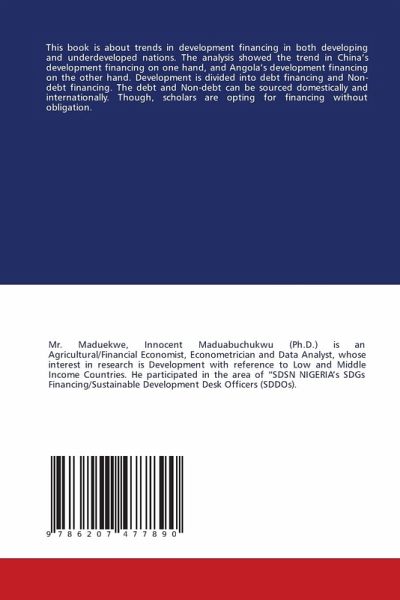 This book is about trends in development financing in both developing and underdeveloped nations. The analysis showed the trend in China's development financing on one hand, and Angola's development financing on the other hand. Development is divided into debt financing and Non-debt financing. The debt and Non-debt can be sourced domestically and internationally. Though, scholars are opting for financing without obligation.