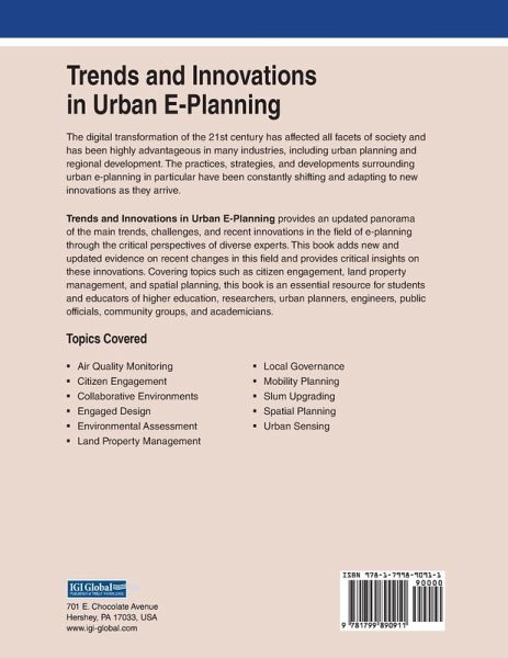 The digital transformation of the 21st century has affected all facets of society and has been highly advantageous in many industries, including urban planning and regional development. The practices, strategies, and developments surrounding urban e-planning in particular have been constantly shifting and adapting to new innovations as they arrive. Trends and Innovations in Urban E-Planning provides an updated panorama of the main trends, challenges, and recent innovations in the field of e-planning through the critical perspectives of diverse experts. This book adds new and updated evidence on recent changes in this field and provides critical insights on these innovations. Covering topics such as citizen engagement, land property management, and spatial planning, this book is an essential resource for students and educators of higher education, researchers, urban planners, engineers, public officials, community groups, and academicians.