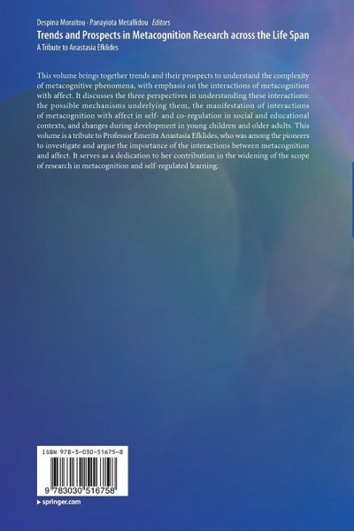 This volume brings together trends and their prospects to understand the complexity of metacognitive phenomena, with emphasis on the interactions of metacognition with affect. It discusses the three perspectives in understanding these interactions: the possible mechanisms underlying them, the manifestation of interactions of metacognition with affect in self- and co-regulation in social and educational contexts, and changes during development in young children and older adults. This volume is a tribute to Professor Emerita Anastasia Efklides, who was among the pioneers to investigate and argue the importance of the interactions between metacognition and affect. It serves as a dedication to her contribution in the widening of the scope of research in metacognition and self-regulated learning.