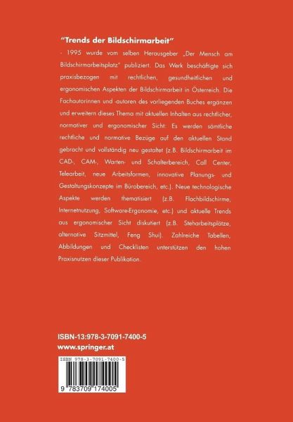 Die Entwicklungen, ergonomischen Erkenntnisse und rechtlichen Rahmenbedingungen zum Thema Bildschirmarbeit sowie deren praktische Umsetzung werden in diesem aktuellen Handbuch klar und verständlich dargestellt. Sämtliche rechtlichen und normativen Bezüge sind auf dem neuesten Stand (z.B. Bildschirmarbeits-Verordnung, Arbeitsstättenverordnung, Arbeitnehmerschutz im öffentlichen Dienst, Europäische Normen, etc.). Aktuelle Aspekte der Bildschirmarbeit werden behandelt: Bildschirmarbeit im CAD-, CAM-, Warten- und Schalterbereich, Call Center, Telearbeit, Workflow-Systeme, etc. Neue technologische Entwicklungen (Flachbildschirme, Internetnutzung, Software-Ergonomie, etc.) und aktuelle Trends aus ergonomischer Sicht (Steharbeitsplätze, alternative Sitzmittel, Feng Shui) werden thematisiert und diskutiert.