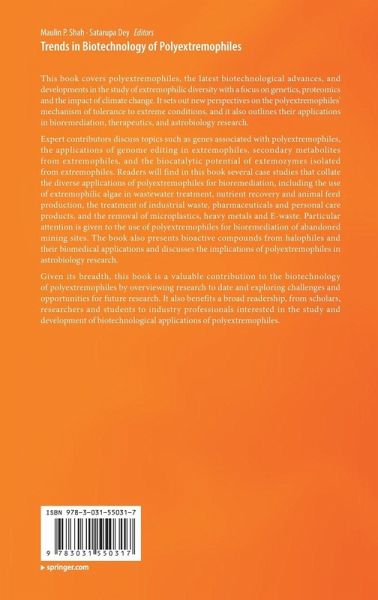 Overview of the Genes Associated with Polyextremophiles.- Genetics and proteomics of polyextremophiles existing in high temperature .- Applications of genome editing in extremophiles.- Extremophiles: How Smart are the Cells to Cope with the Environment?.- Impact of Climate Change on Polar Polyextremophilic Diversity, with a Focus on Genetics and Proteomics.- Implications of polyextremophiles in astrobiology research.- The Biocatalytic Potential of Extemozymes isolated from extremophiles.- Secondary Metabolites from extremophiles.- Salting Up Our Knowledge: The Fascinating Halophiles, Their Bioactive Metabolites with Biomedical Implications.- Application of Extremophiles in therapeutics.- Extremophilic algae-based wastewater treatment, nutrient recovery and animal feed production.- Potentiality of polyextremophilic organisms in bioremediation of aromatic hydrocarbons and persistent organic pollutants- A biotechnological approach.- Role of extremophilic microbes in removal of microplastics.- Indigenous microbiota of acid mine environment and their role in the bioremediation of abandoned mining sites.- Role of extremophiles in the removal of heavy metal and E-waste.- Exploitation of Potential Extremophiles for Bioremediation of Microplastics: A Biotechnological Approach.- Lignin valorization using lignolytic microbe and enzymes: The challenges and opportunities.- Biotechnology of extremophiles advances and challenges.- Role of extremophiles in treatment of industrial waste, pharmaceuticals and personal care products.
