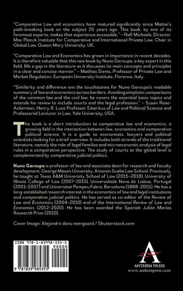 The book is a short introduction to comparative law and economics, a growing field in the interaction between law, economics and comparative political science. It is a guide to economists, lawyers and political scientists looking for a brief overview. It includes both strands of the traditional literature, namely the role of legal families and microeconomic analysis of legal rules in a comparative perspective. The study of courts at the global level is complemented by comparative judicial politics.