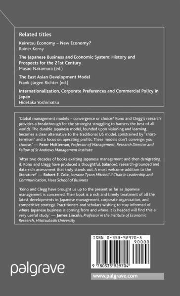 'After two decades of books exalting Japanese management and then denigrating it, Kono and Clegg have produced a thoughtful, balanced, research-grounded and data-rich assessment that truly stands out. A most welcome addition to the literature!' - Robert E. Cole, Lorraine Tyson Mitchell II Chair in Leadership and Communication, Haas School of Business