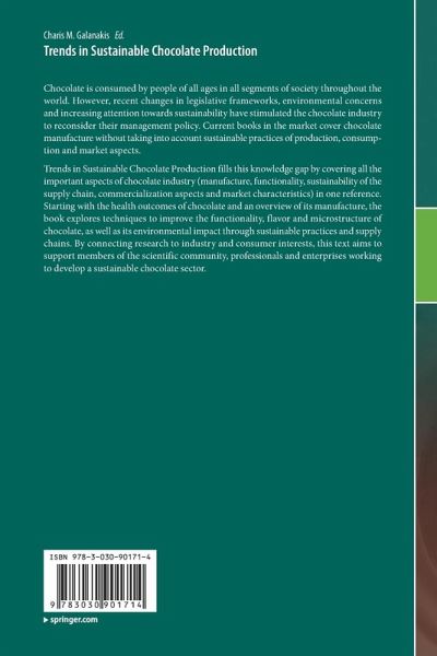 Chocolate is consumed by people of all ages in all segments of society throughout the world. However, recent changes in legislative frameworks, environmental concerns and increasing attention towards sustainability have stimulated the chocolate industry to reconsider their management policy. Current books in the market cover chocolate manufacture without taking into account sustainable practices of production, consumption and market aspects.