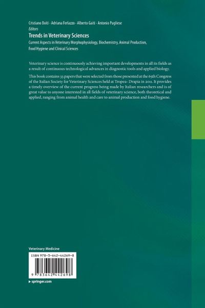 Veterinary science is continuously achieving important developments in all its fields as a result of continuous technological advances in diagnostic tools and applied biology.This book contains 33 papers that were selected from those presented at the 65th Congress of the Italian Society for Veterinary Sciences held at Tropea-Drapia in 2011. It provides a timely overview of the current progress being made by Italian researchers and is of great value to anyone interested in all fields of veterinary science, both theoretical and applied, ranging from animal health and care to animal production and food hygiene.