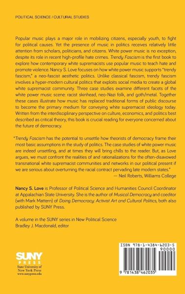 Popular music plays a major role in mobilizing citizens, especially youth, to fight for political causes. Yet the presence of music in politics receives relatively little attention from scholars, politicians, and citizens. White power music is no exception, despite its role in recent high-profile hate crimes.Trendy Fascism is the first book to explore how contemporary white supremacists use popular music to teach hate and promote violence. Nancy S. Love focuses on how white power music supports "trendy fascism," a neo-fascist aesthetic politics. Unlike classical fascism, trendy fascism involves a hyper-modern cultural politics that exploits social media to create a global white supremacist community. Three case studies examine different facets of the white power music scene: racist skinhead, neo-Nazi folk, and goth/metal. Together these cases illustrate how music has replaced traditional forms of public discourse to become the primary medium for conveying white supremacist ideology today. Written from the interdisciplinary perspective on culture, economics, and politics best described as critical theory, this book is crucial reading for everyone concerned about the future of democracy.