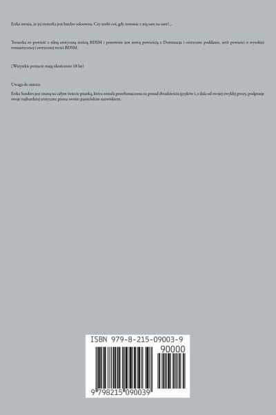 Erika uważa, że jej trenerka jest bardzo seksowna. Czy zrobi coś, gdy zostanie z nią sam na sam?... Trenerka to powieśc z silną erotyczną treścią BDSM i ponownie jest nową powieścią z Dominacja i erotyczne poddanie, serii powieści o wysokiej romantycznej i erotycznej treści BDSM. (Wszystkie postacie mają ukończone 18 lat) Uwaga do autora: Erika Sanders jest znaną na calym świecie pisarką, która zostala przetlumaczona na ponad dwadzieścia języków i, z dala od swojej zwyklej prozy, podpisuje swoje najbardziej erotyczne pisma swoim panieńskim nazwiskiem.