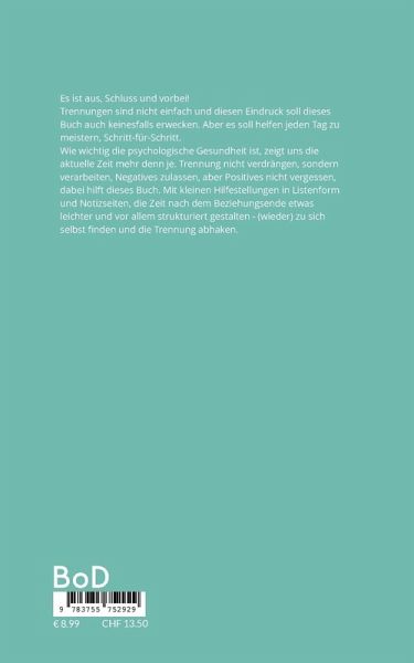 Es ist aus, Schluss und vorbei!Trennungen sind nicht einfach und diesen Eindruck soll dieses Buch auch keinesfalls erwecken. Aber es soll helfen jeden Tag zu meistern, Schritt-für-Schritt.Wie wichtig die psychologische Gesundheit ist, zeigt uns die aktuelle Zeit mehr denn je. Trennung nicht verdrängen, sondern verarbeiten, Negatives zulassen, aber Positives nicht vergessen, dabei hilft dieses Buch.Mit kleinen Hilfestellungen in Listenform und Notizseiten, die Zeit nach dem Beziehungsende etwas leichter und vor allem strukturiert gestalten - (wieder) zu sich selbst finden und die Trennung abhaken.