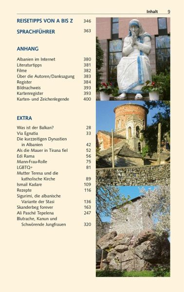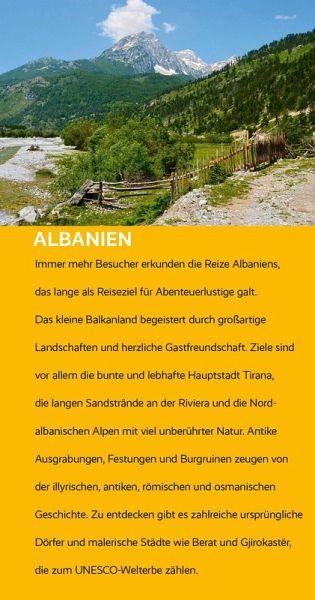 Der in Tirana gebürtige Autor und Reiseleiter Shkëlzen Alite kennt jeden Winkel im Land. In diesem Reiseführer gibt er tiefen Einblick in Albaniens Naturschönheiten, die Landesgeschichte, seine Traditionen und Lebensart und macht mit allen Sehenswürdigkeiten ausführlich bekannt. Von der Antike bis zur kommunistischen Ära hat jede Epoche ihre Spuren hinterlassen. Festungen und Burgruinen zeugen von der illyrischen, römischen, byzantinischen und osmanischen Vergangenheit. Ausgrabungsstätten wie Apollonia und Butrint zählen zum UNESCO-Welterbe. Ebenso die Städtchen Berat und Gjirokastër, die mit Häusern in typischer Balkanarchitektur, Kirchen, Moscheen und einer Burg steil auf dem Berghang bezaubern. Die Hauptstadt Tirana erfreut mit lebhaft-buntem Metropolen-Flair.