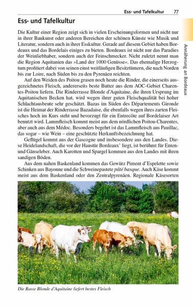 In den Lokalen rund um die Place Saint-Pierre oder im Quartier des Chartrons werden die Köstlichkeiten der Region aufgetragen. Im umliegenden Bordelais keltert man die kostbarsten Weine. Ausflüge führen auf der Route des Châteaux ins Médoc zu den Weingütern sowie ins malerische Welterbe-Weindorf Saint-Émilion. Wer noch weiter will, besucht die Austernfischer im Becken von Arcachon und die traumhaften Strände der Côte d'Argent.