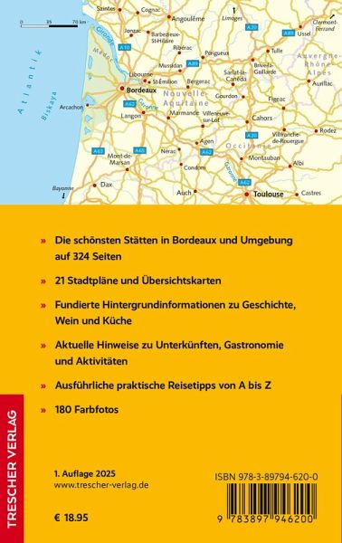 Der Trescher-Reiseführer BORDEAUX UND BORDELAIS lädt mit vielen Tipps für Restaurants und Weinproben in die Genussregion ein. Alle Sehenswürdigkeiten und die spannendsten Viertel Bordeaux' werden ausführlich beschrieben. Ausflüge führen ins Bordelais und an die Atlantikküste. Kapitel zur Geschichte, zum Weinbau und zur Tafelkultur vermitteln viel Hintergrundwissen. Ausgesuchte Empfehlungen zu Unterkunft und Freizeitaktivitäten, ein Sprachführer und zahlreiche reisepraktische Tipps ergänzen das Buch zum perfekten Begleiter für einen Citytrip wie für einen längeren Urlaub.