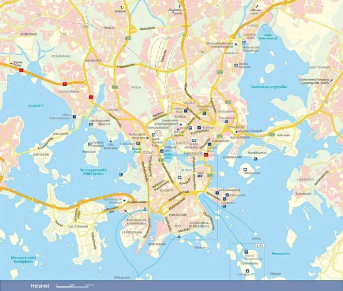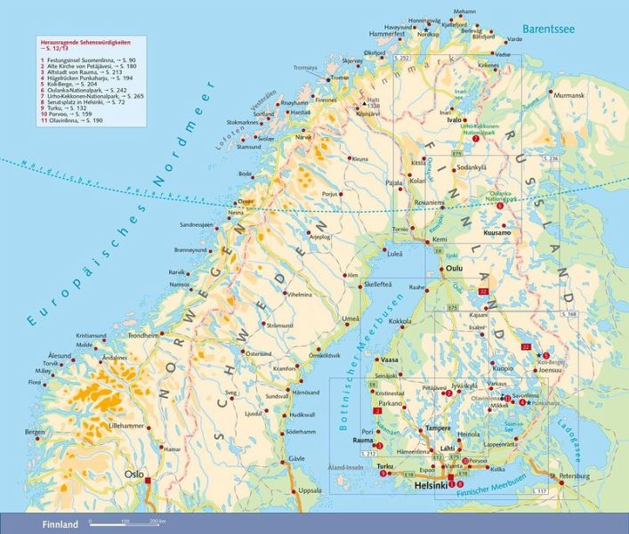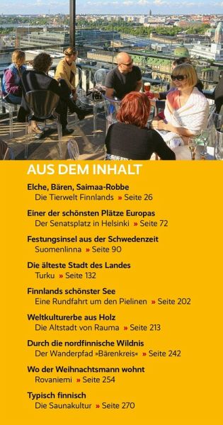 UNESCO-Welterbestätten wie die Seefestung Suomenlinna oder diekleine Hafenstadt Rauma, die historische Holzhäuser zieren, gehören zu den besonderen Attraktionen. Mit typisch bunten Holzhäuschen warten am schönsten außerdem Porvoo und an der Westküste Kokkola und Kristinestad auf. Ein ganzes Kapitel ist der Metropole Helsinki und ihren Architektur-Highlights gewidmet. Die Weltsaunahauptstadt Tampere sowie Lahti, Tor zur Seenplatte, und Turku am Schärenmeer werden ebenfalls ausführlich beschrieben.