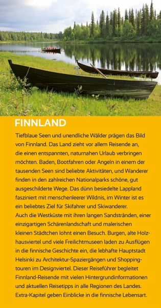 Unendliche Seen und Wälder prägen Suomi, wie die Finnen ihr Heimatland nennen. Hoch oben im Norden fasziniert Lappland mit arktischer Wildnis und der magischen Farbenpracht des Polarlichts. In über 40 Nationalparks finden Naturbegeisterte ein riesiges Wanderwegenetz. Die Seenplatte im Herzen Finnlands lädt mit Tausenden labyrinthischen Gewässern zum Segeln, Paddeln und Angeln ein. Die Westküste lockt mit langen Sandstränden und die Schären mit über 50.000 im Meer verstreuten Eilanden. Dazu kommt hier wie dort die kleine Hütte am See, wo man sich in der stillen Natur mit Sauna und Badegang vom Alltag entspannen kann.