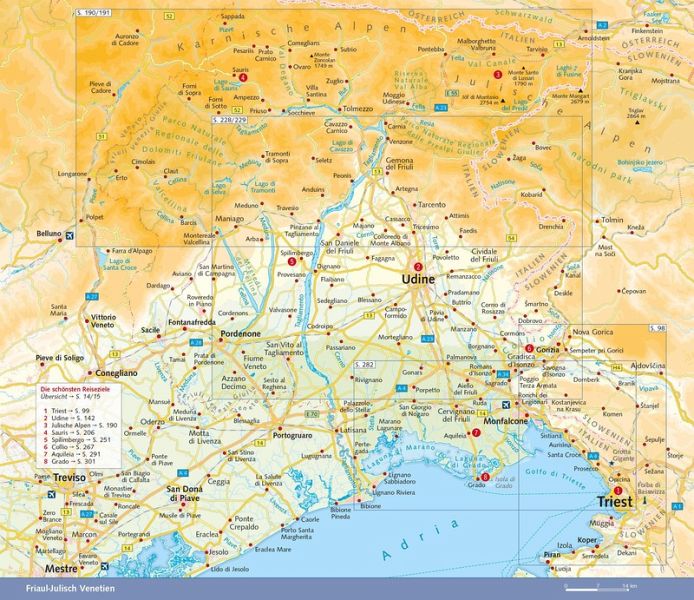 Im Norden laden die Felstürme der Karnischen und Julischen Alpen mit ihren urigen Bergdörfern zum Klettern und Wandern ein. Ein Paradies für alle, die Ursprünglichkeit und Entschleunigung suchen. Weiter südlich schmückt sich die friulanische Tiefebene mit Obst- und Weingärten. Charmante Städtchen, mittelalterliche Burgen, langobardische und venezianische Kunstschätze begeistern Kunst- und Kulturinteressierte. Genießer schwärmen vom Schinken aus San Daniele, dem strohgelben Montasiokäse und den Weißweinen, die im Weinbaugebiet Collio gekeltert werden. Badeurlauber kommen an den kilometerlangen feinsandigen Adriastränden auf ihre Kosten.
